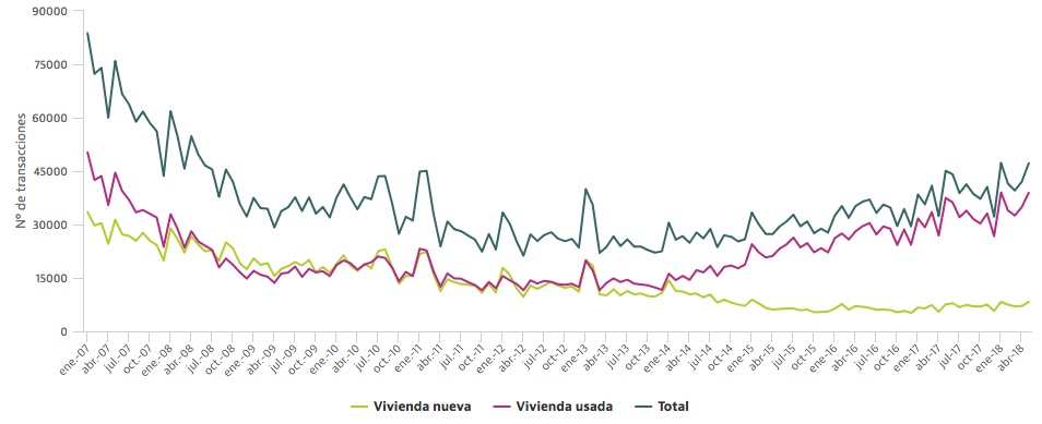 За первые пять месяцев 2018 года покупки домов увеличилось на 13% по сравнению с аналогичным периодом прошлого года и составили 217 539 операций. Если все будет следовать этой тенденции и смотреть эволюцию последних 12 месяцев, то можно ожидать, что показатель превысит 490 000 продаж, что примерно на 5% больше, чем в 2017 году.